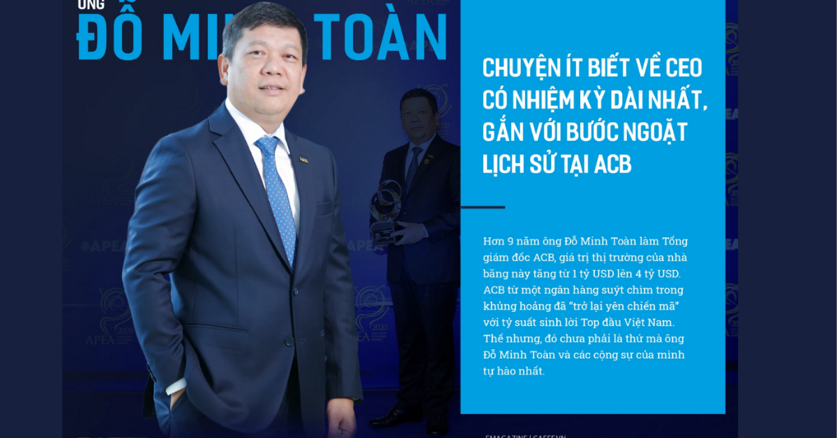 VỀ VỊ CEO CÓ NHIỆM KỲ DÀI NHẤT ACBXem thêm >>Hơn 9 năm ông Đỗ Minh Toàn làm Tổng giám đốc ACB, giá trị thị trường của nhà băng này tăng từ 1 tỷ USD lên 4 tỷ USD. ACB từ một ngân hàng suýt chìm trong khủng hoảng đã “trở lại yên chiến mã” với tỷ suất sinh lời Top đầu Việt Nam. Thế nhưng đó chưa phải là thứ mà ông tự hào nhất.